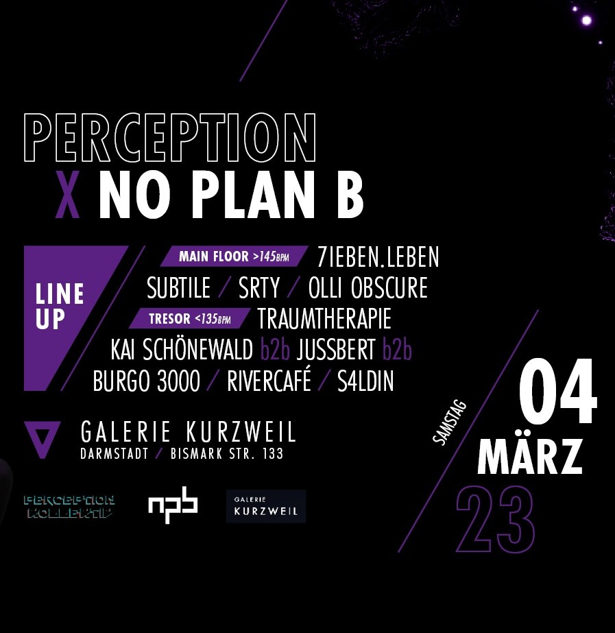 Es wird düster, es wird harmonisch, es wird bunt & abwechslungsreich! Neben zwei Floors die euch mit unterschiedlichem Sound versorgen, wird eine Menge künstlerisches und visuelles Programm geboten, um euch eine unvergessliche Experience zu garantieren. Dieses mal wird der Main Floor von No Plan B bespielt und dabei wird es hart, schnell, düster aber auch hypnotisierend mit einem ungewohnten Lichtkonzept. Mit seidig, perligem Klang bis hin zu buntem Techno verwöhnt euch die Perception auf dem zweiten Floor.